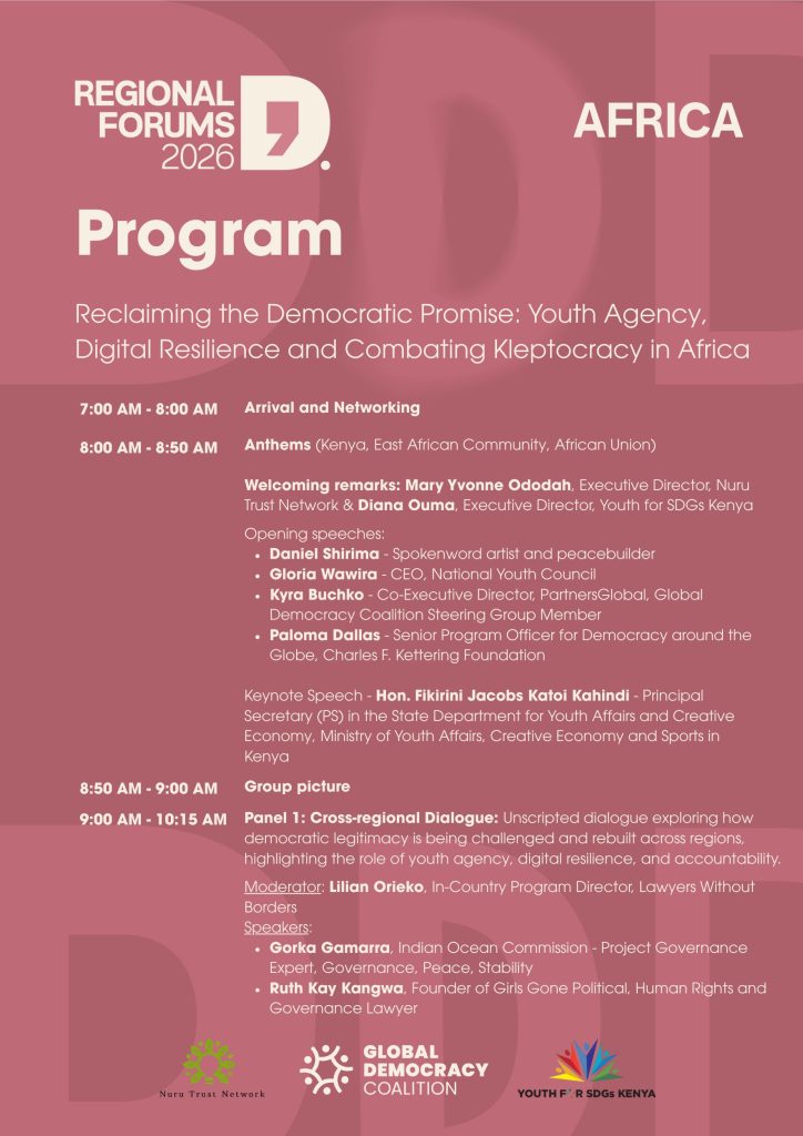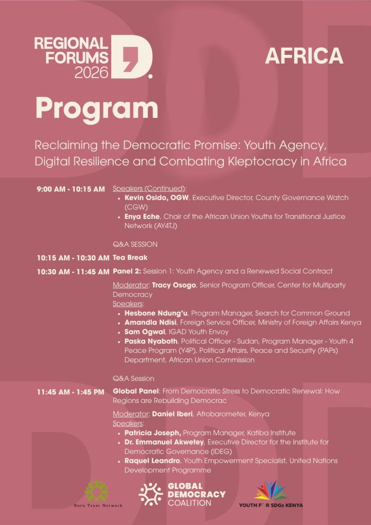 The Africa Regional Forum 2026 will leverage elections, civic movements, and digital engagement to advance youth agency, women’s leadership, digital resilience, and anti-kleptocracy, aiming to rebuild trust and protect civic space continentwide. This dialogue will interrogate Africa’s evolving democratic landscape. The forum will ground analysis in lived experiences, draw insight from practitioners and experts, and create space for honest exchange on how civic movements, elections, and digital tools can be reclaimed as instruments of accountability rather than control. This convening is not just a conversation, it is a strategic intervention to help shape a more inclusive, resilient, and participatory future for the continent.