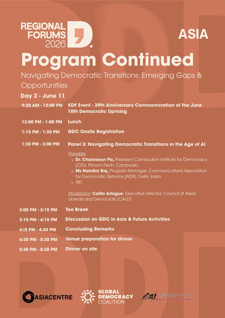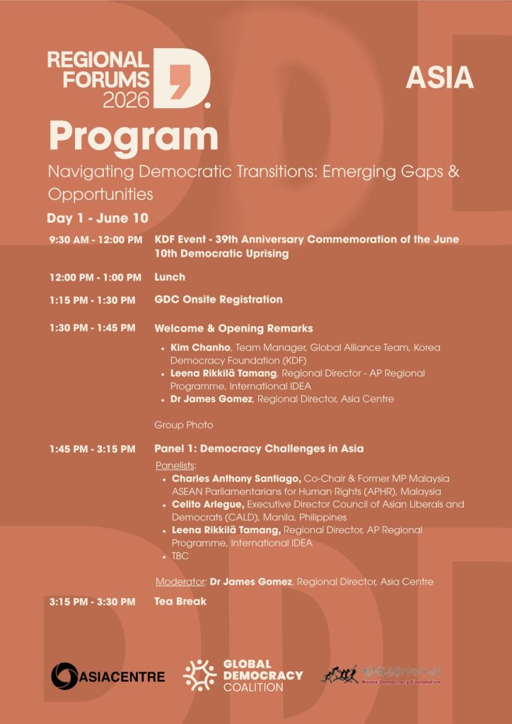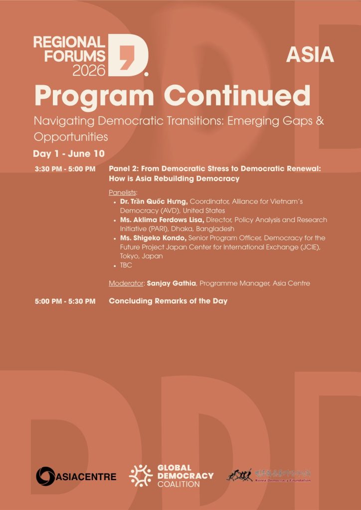 - A concise regional synthesis report feeding into the Global Democracy Coalition Forum 2026, contributing Asia-Pacific insights to global discussions on democratic resilience, transition, and renewal.
