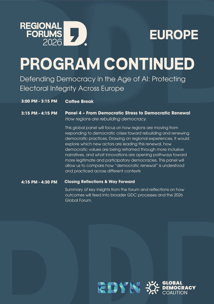 8. An actionable regional briefing feeding into the Global Democracy Coalition Forum 2026 report and supporting global discussions on democratic resilience in the age of AI.